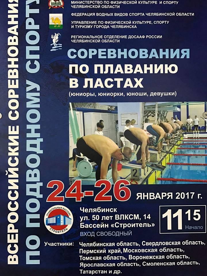 С 23 по 27 января 2017 года в г. Челябинске (плавательный бассейн «Строитель») прошли Всероссийские соревнования по подводному спорту (плавание в ластах) в двух возрастных группах: юноши, девушки (12-13 лет) и юниоры, юниорки (14-17 лет).